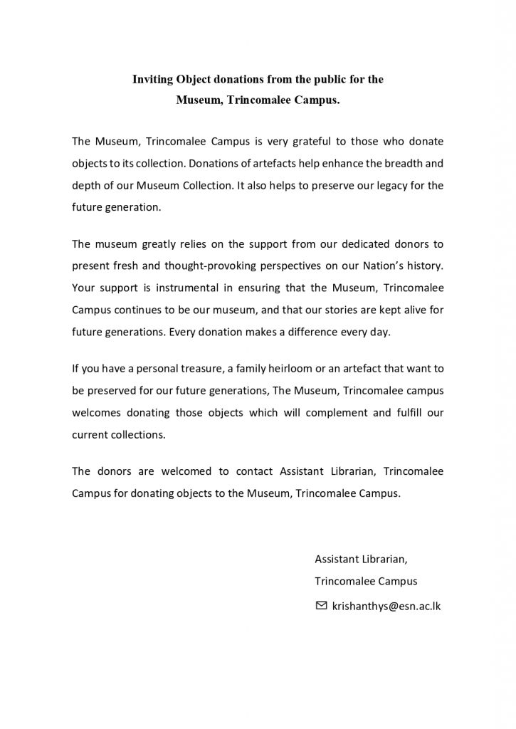 Inviting Object donations from the public for the Museum, Trincomalee Campus